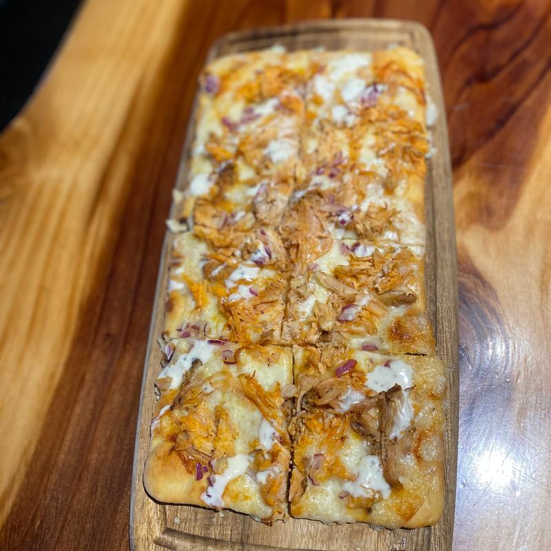 Shredded chicken tossed in Frank's Red Hot sauce on a bed of mozzarella, topped with chopped red onion & ranch drizzle